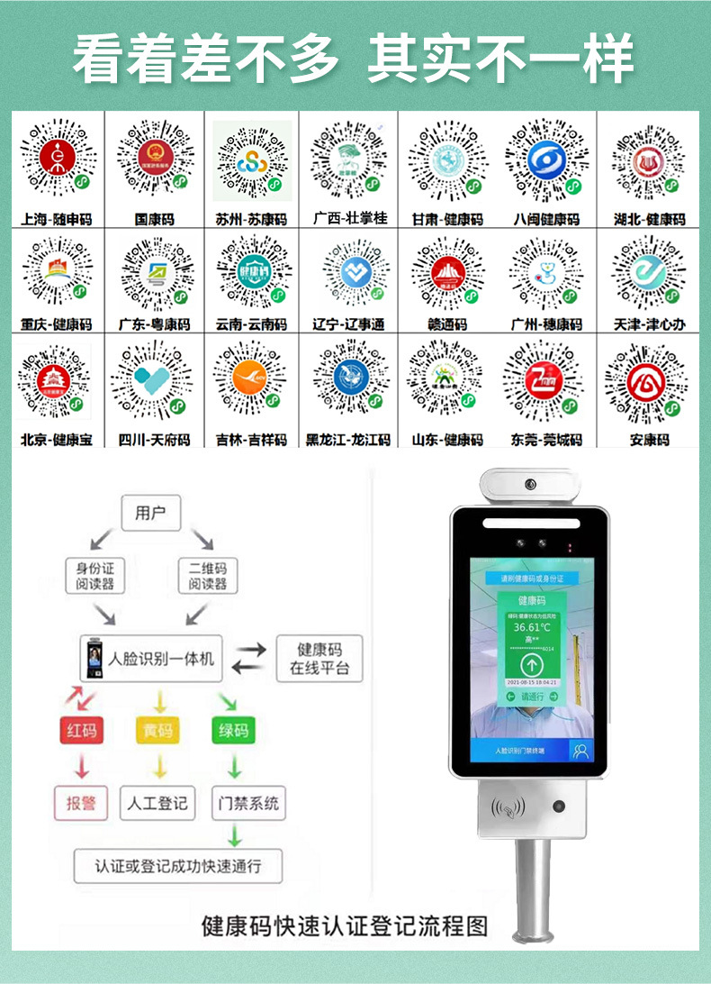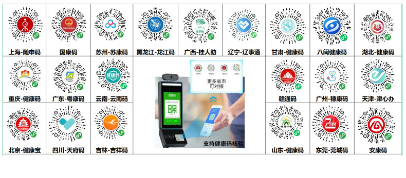 國家通用碼-國康碼、廣東-粵康碼、四川-天府通、江蘇-蘇康碼、內(nèi)蒙-內(nèi)蒙碼、上海-隨申碼、湖北-湖北碼、安徽-安徽碼、福建-八閩碼、河北健康碼、云南-云南碼、湖南-湖南碼,更多省市可對接。
