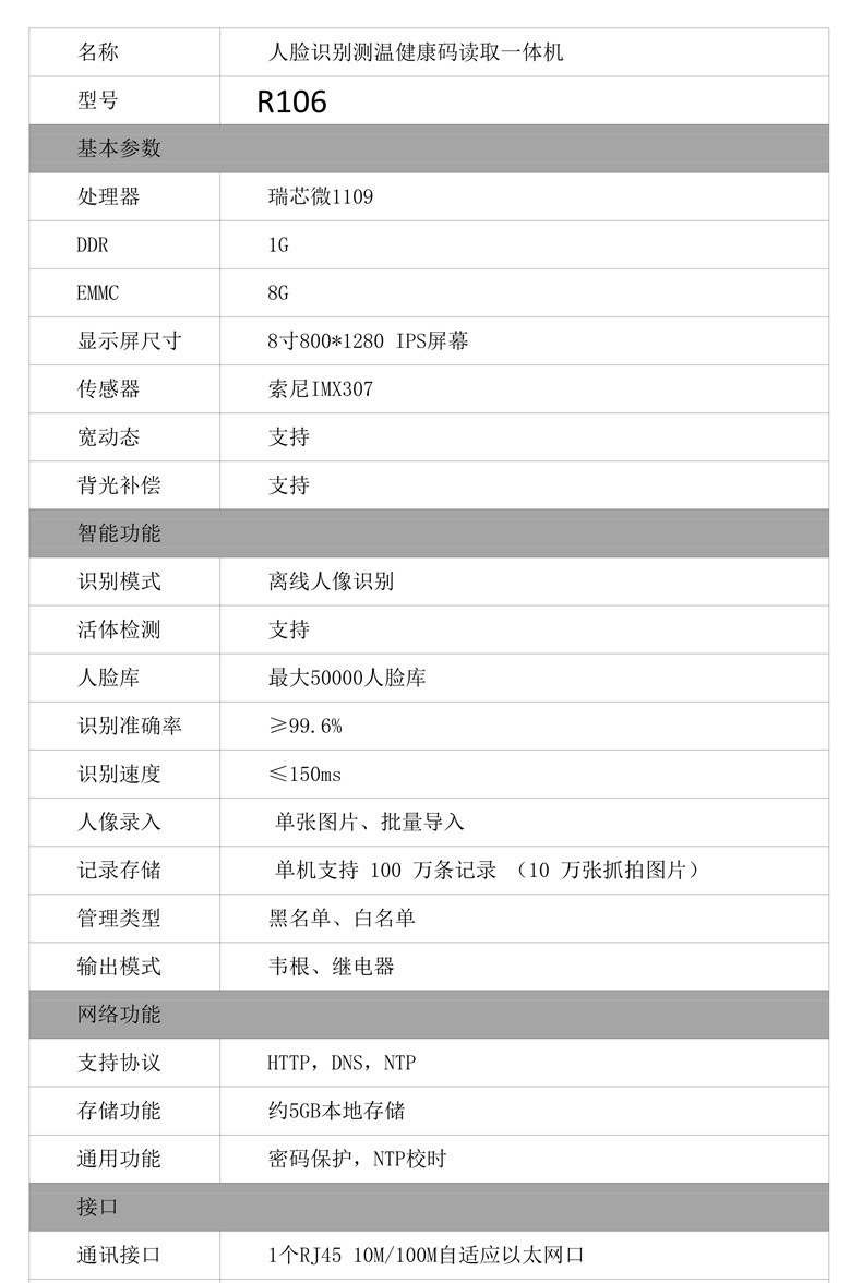 (*由于產(chǎn)品升級或其他原因,明創(chuàng)IDR-R106健康碼識別機產(chǎn)品實際參數(shù)有可能變更,以實際產(chǎn)品為準(zhǔn)。本文中的所有陳述、信息和建議也不構(gòu)成任何明示或暗示的擔(dān)保)
