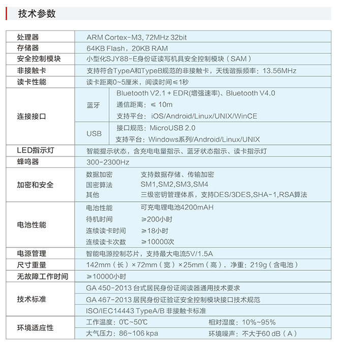 IDR240產(chǎn)品內(nèi)置公安部授權(quán)的小型化SJYY88-E身份證讀寫機(jī)具安全控制模塊(SAM)和藍(lán)牙模塊,可讀取居民身份證信息,通過藍(lán)牙或USB接口上傳到計(jì)算機(jī)進(jìn)行解碼,實(shí)現(xiàn)居民身份證的有效性驗(yàn)證、存儲(chǔ)、查詢和打印,支持核查名單提示。可對(duì)接各類業(yè)務(wù)系統(tǒng),可兼容讀寫其他行業(yè)定制的基于TypeA、TypeB規(guī)范的行業(yè)非接觸卡。內(nèi)置大容量高能鋰電池,支持快速充電,智能電源管理提升續(xù)航能力。
